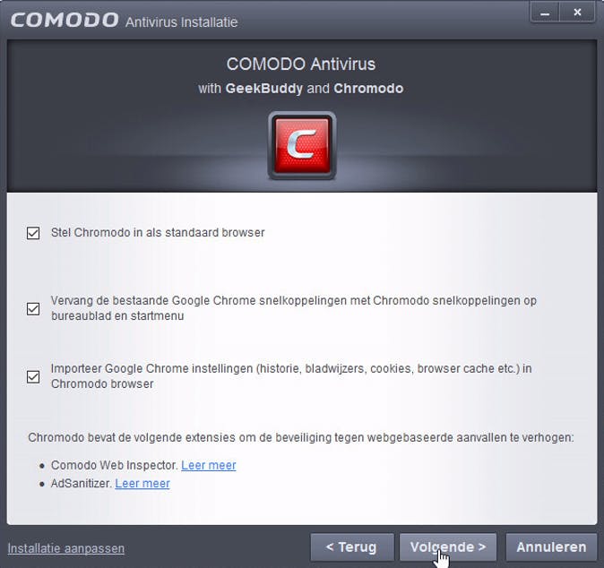 Lastige vragen tijdens de installatie van Comodo Antivirus.