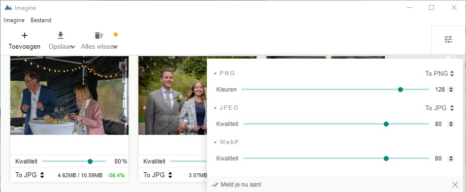 Via de knop rechtsboven leg je de globale instellingen vast voor zowel jpg, png als webp. Klik op de foto om het resultaat voor en na de compressie te bekijken. Via de plus- en minknop zoom je in of uit. Een foto bewaren doe je via de pijlknop boven de foto. Of je gebruikt het menu Opslaan om alle foto’s in één keer te bewaren. Je doet er misschien goed aan om voor Opslaan als te kiezen of Automatisch opslaan onder een nieuwe naam. Ziet alles er goed uit, dan kun je de originele foto’s eventueel verwijderen.