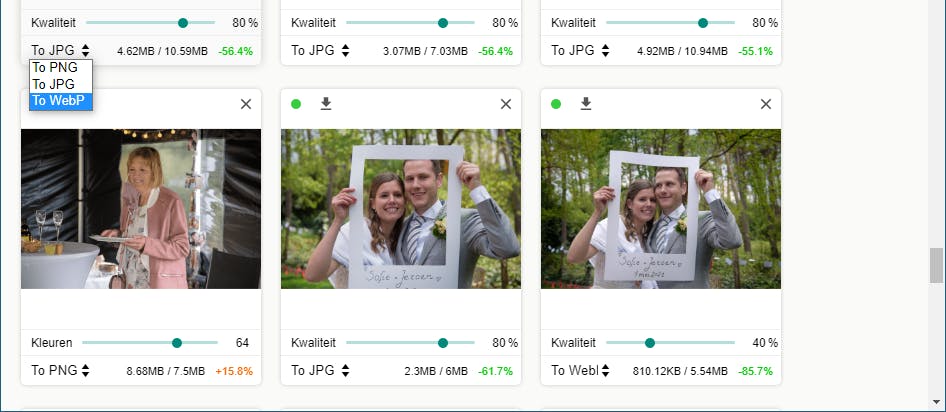Bij elke foto staat een schuifknop waarmee je de kwaliteit iets vermindert. Je leest de ruimtewinst af die je dat oplevert. Het is dus mogelijk om voor elke foto een aangepaste kwaliteit te kiezen. Klik op het pijlknopje om het uitvoerformaat in te stellen: jpg, png of webp.