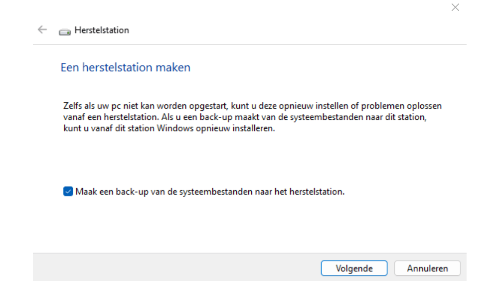 Open het Startmenu en typ herstelstation. Een nieuw venster wordt geopend. Plaats een vinkje bij Maak een back-up van de systeembestanden naar het herstelstation. Met die optie zorg je ervoor dat Windows de belangrijkste bestanden van het besturingssysteem ook naar het herstelstation kopieert. Klik op Volgende. Een overzicht van stations verschijnt, waaronder de usb-stick. Selecteer deze bij Beschikbare stations en klik op Volgende / Maken.