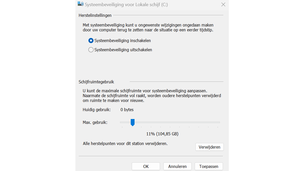 Open het Startmenu, typ herstelpunt en kies Een herstelpunt maken. Selecteer de schijf waarvan je een herstelpunt wilt maken en klik op Configureren. Kies Systeembeveiliging inschakelen. Bij Schijfruimtegebruik bepaal je hoeveel ruimte voor de herstelpunten wordt gereserveerd. Is de ruimte vol, dan wordt het oudste herstelpunt telkens verwijderd. Klik op OK en kies hierna voor Maken om meteen een herstelpunt te maken. Geef het herstelpunt een goede beschrijving en volg de stappen van de wizard.