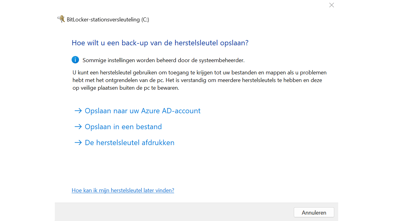 Open het Startmenu en typ bitlocker. Kies BitLocker beheren en klik op Back-up maken van uw herstelsleutel. Windows vraagt waar je de back-up wilt maken. Kies bijvoorbeeld voor Opslaan in een bestand en bewaar de sleutel op een veilig medium, zoals een usb-stick. Ook kun je kiezen voor de optie De herstelsleutel afdrukken, als je de sleutel op een fysiek papier wilt bewaren (of ‘afdrukken’ naar een pdf-bestand, waarna je de pdf opslaat).
