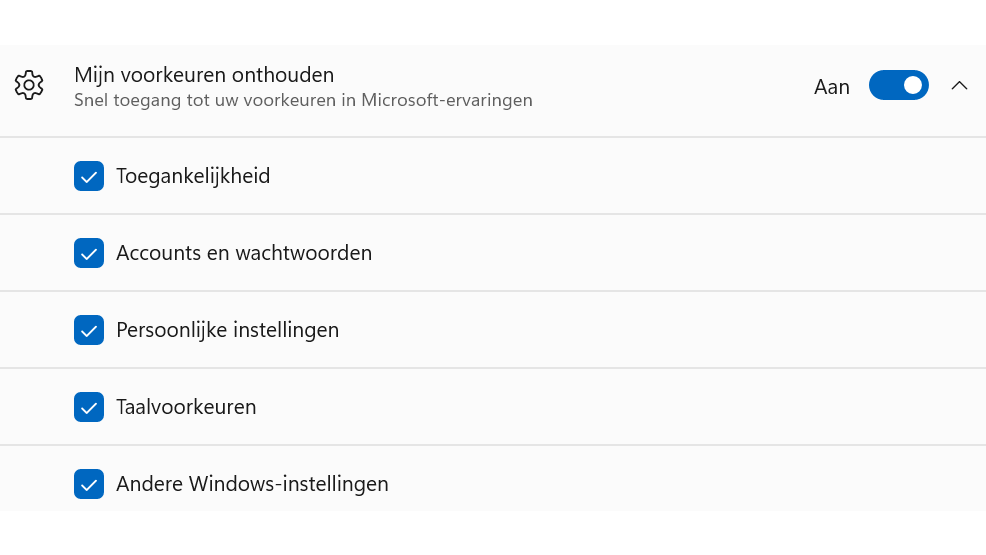 Tot slot helpt Windows back-up met het opslaan van je persoonlijke instellingen, waardoor je deze in geval van nood snel weer kunt terugzetten. Klap de sectie Mijn voorkeuren onthouden uit en zorg er ook voor dat de bijbehorende schuif op Aan staat. Hier zie je vijf onderdelen die Windows kan veiligstellen, zoals Persoonlijke instellingen en Accounts en wachtwoorden. Plaats een vinkje naast de items die je wilt veiligstellen.