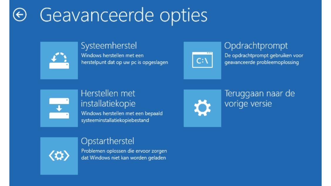 Kun je Windows niet meer starten én heb je geen herstelstation gemaakt? Je kunt de herstelomgeving in sommige gevallen alsnog bereiken. De truc schuilt in het meerdere malen opnieuw in- en uitschakelen van de computer. Schakel de computer eerst uit en weer in. Zodra Windows net is gestart, druk je wederom op de aan-uitknop om de computer uit te schakelen. Schakel de computer hierna weer in en herhaal deze actie tweemaal. Laat de computer hierna weer volledig inschakelen. Een herstelmenu verschijnt. Kies voor Geavanceerde opties / Problemen oplossen.