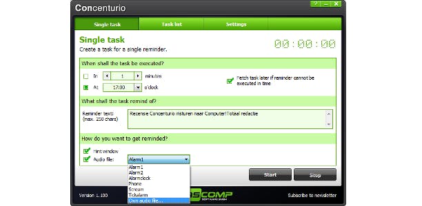 U kunt zich op twee manieren laten herinneren: via een pop-upvenster en/of via een zelf te kiezen geluidsalarm. Handig is de optie om u achteraf alsnog aan die taak te laten herinneren als Concenturio op het ingestelde tijdstip niet actief was.