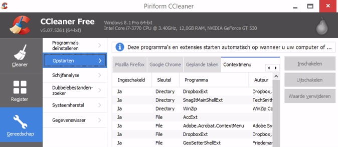 Je downloadt (de gratis versie van) CCleaner via de website. Zodra je het programma hebt gestart word je overladen met opties. Daar hoef je in dit geval niet op te letten, we gaan alleen voor het opschonen van het rechtsklikmenu. Klik op de knop Gereedschap en vervolgens op de optie Opstarten. Er verschijnt een pagina met een aantal tabbladen. Blader naar rechts en klik vervolgens op het tabblad Contextmenu. Hier zie je een overzicht van alles wat er in het contextmenu staat. Klik op de optie die je wilt uitschakelen en vervolgens op de knop Uitschakelen. In theorie zou je ook kunnen klikken op Waarde verwijderen, maar we geven de voorkeur aan Uitschakelen, omdat dat een omkeerbaar proces is. Het zou immers zomaar kunnen zijn dat je iets verwijdert dat je later toch op prijs blijkt te stellen. Neem hiervoor de tijd, dat zal je uiteindelijk heel wat meer gebruiksgemak opleveren.