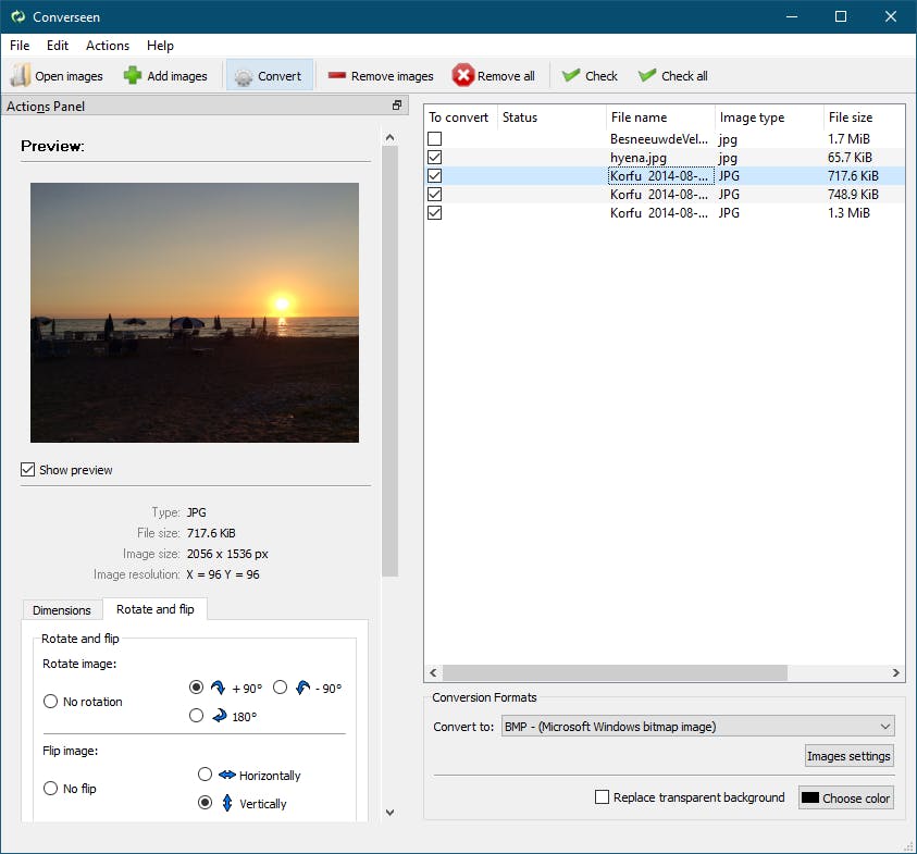 Je dient eerst alle gewenste bestanden in Converseen op te halen. Vanuit het menu of via een eenvoudige versleepbeweging kun je meerdere bestanden tegelijk importeren. Houd er wel rekening mee dat alleen de bestanden waar je een vinkje bij plaatst zullen worden omgezet. In het actievenster links krijg je standaard een voorbeeldweergave van het geselecteerde beeldbestand te zien. Onderaan vind je de conversie-opties, opgedeeld in twee tabbladen: Dimensions en Rotate and flip, wat gelijk aangeeft welke manipulaties mogelijk zijn. Je kunt namelijk plaatjes schalen (uitgedrukt in pixelgrootte of percentage), al dan niet met behoud van de beeldverhoudingen, en ook de resolutie aanpassen. Verder kun je een afbeelding roteren en horizontaal en/of verticaal spiegelen. Een minpunt is wel dat de voorbeeldweergave je gewijzigde instellingen niet reflecteren.