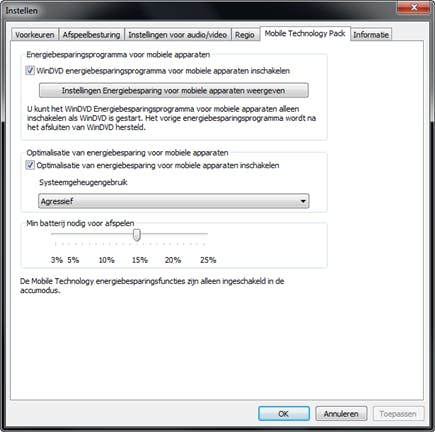 Corel heeft tijdens het creëren van deze software ook gedacht aan de laptopgebruikers. Via Instellen in het rechtermuisknopmenu kunt u het geavanceerde energiebeheer van WinDVD Pro 2010 naar uw hand zetten. Op het tabblad Mobile Technology Pack kunt u het gebruik van het systeemgeheugen zelf instellen, u hebt de keuze uit Agressief, Gemiddeld of Besparend. Bovendien kunt u instellen hoeveel het resterende accupercentage moet bedragen om nog dvd’s of blu-rays te kunnen afspelen. De energiebesparende functies zijn trouwens uitsluitend van kracht indien u in accumodus werkt.