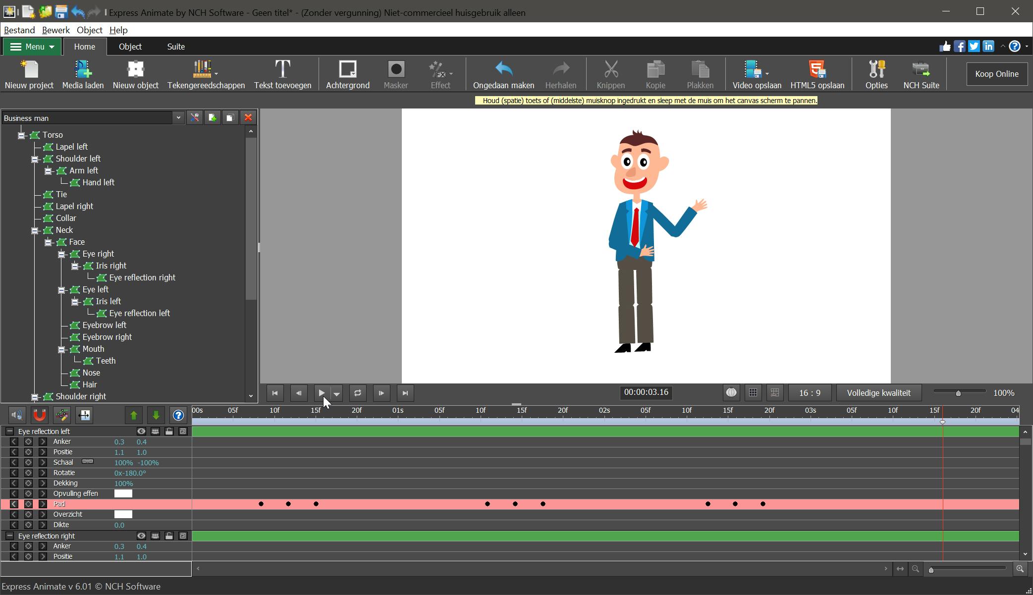 Dan gaan we naar het lint met Home, Object en Suite. Op Home staan de meestgebruikte taken, zoals het kunnen laden van media en het kunnen toevoegen van objecten. Object kan onder andere worden gebruikt om objecten te tekenen. Suite verwijst naar alle andere NCH-producten die kennelijk naast elkaar kunnen worden geïnstalleerd.