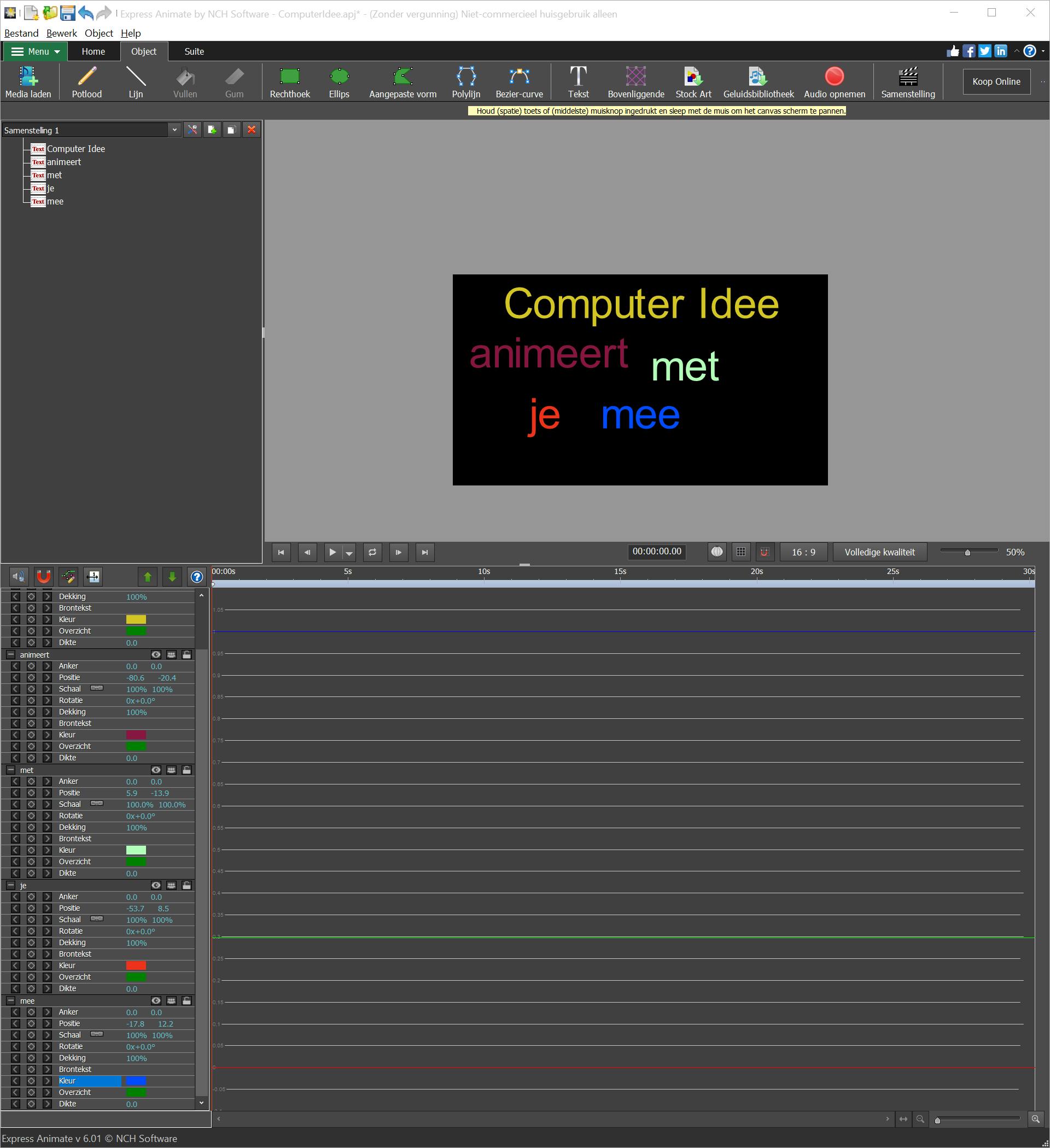 Je kunt overigens de mini-editor er altijd weer bij pakken door in het Canvas Panel op het tekstobject te klikken. Maak van deze gelegenheid gebruik om nog wat meer teksten op het Canvas Panel te plaatsen. Zet die teksten, met behulp van de pijltjes van het Object Panel, op de juiste hiërarchische positie in het Composition Panel. Geef de teksten allemaal een eigen kleur om wat onderscheid te maken. Toegegeven, daarmee hebben we nog geen animatie gemaakt, maar alle voor die animatie benodigde objecten zitten inmiddels wel in het project.