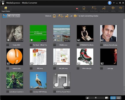 Wanneer u het programma voor het eerst start, zult u merken dat de interface niet enkel erg strak, maar ook intuïtief is. Het is kinderspel om media te importeren. U kunt één of meerdere bestanden of volledige mappen invoeren via de Import Media¬-knop, maar nog handiger is het om te slepen/neerzetten. Over het aantal bestandsformaten hoeft u zich geen zorgen te maken. CyberLink Media Espresso 6 kan met zo goed als alle populaire videoformaten overweg. Op vlak van audiobestanden en afbeeldingen is het programma beperkt tot respectievelijk wma, mp3 en m4a en bmp, jpg en png. Wellicht zal dat in de toekomst nog wel uitbreiden, aangezien Media Espresso in zijn vorige versies helemaal geen audio en afbeeldingen kon converteren.