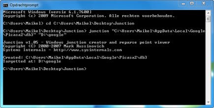 junction "C:\Users\[gebruikersnaam]\AppData\Local\Google\Picasa3\db3" "D:\[gewenste map]\[mapnaam]"