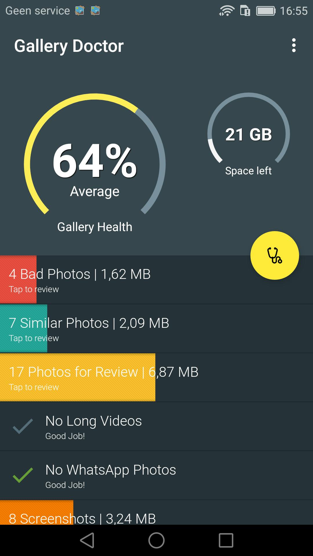 Foto’s en video’s slokken al gauw een enorm deel van je opslagruimte op. Niet alleen als je zelf fanatiek filmt of foto’s schiet, maar ook dankzij WhatsApp loopt je opslagruimte snel vol. Gallery Doctor is een handig appje om bij de hand te hebben. De app analyseert de foto’s die op je apparaat staan en geeft advies welke je kunt verwijderen. Screenshots, dubbele foto’s, WhatsApp-foto’s, maar ook zelfs mislukte foto’s uit je fotomap. Handig is dat de gallerijdokter ook meteen aangeeft hoeveel ruimte je nog vrij hebt en hoeveel je nog vrij kunt maken. Gek is alleen dat de app de standaard-achtergrondafbeeldingen van mijn smartphone allemaal als ‘slechte foto’ markeerde. Het is dus wel aan te raden even na te kijken welke foto’s verwijderd mogen worden.