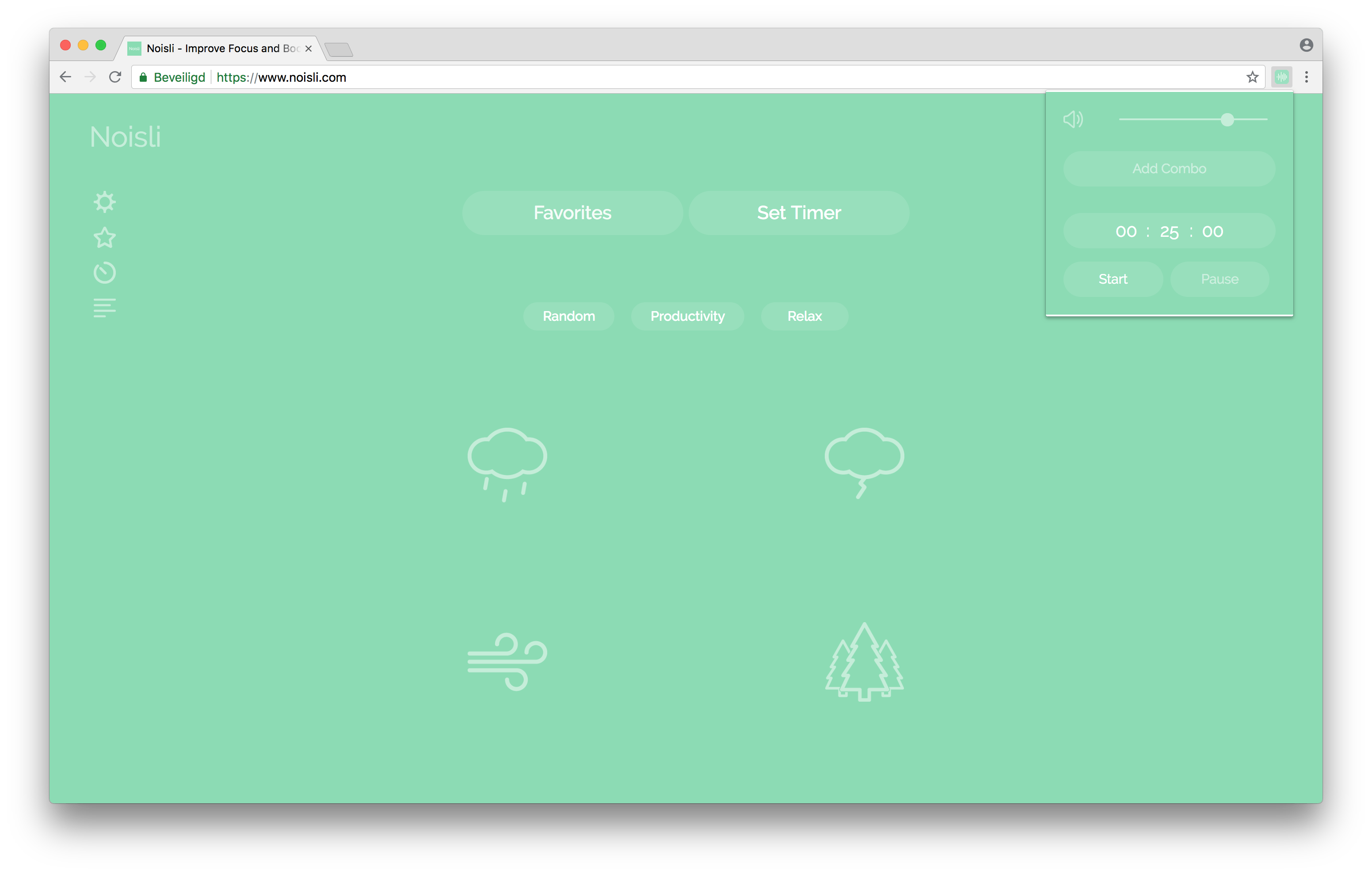 Heb je een hekel aan omgevingsgeluid? Installeer dan Noisli, een extensie waarmee je je eigen omgevingsgeluiden kunt genereren. Wil je het geluid van de zee hebben met een vleugje vogelgeluiden? Geen probleem. Je moet je wel even gratis aanmelden bij de dienst; dat doe je gewoon vanuit de extensie. Om je geluid te creëren, klik je op Add combo. Je wordt nu naar de website van Noisli geleid. Hier klik je op de icoontjes en je hoort meteen het geluid. Eronder vind je een volumeschuif om het volume van alleen dit geluid te bepalen. Bovenin bepaal je hoe hard de combinatie van alle geluiden is. Je kunt ook een timer instellen, eventueel inclusief een fade-out van alle geluiden van 5, 15 of 30 seconden.