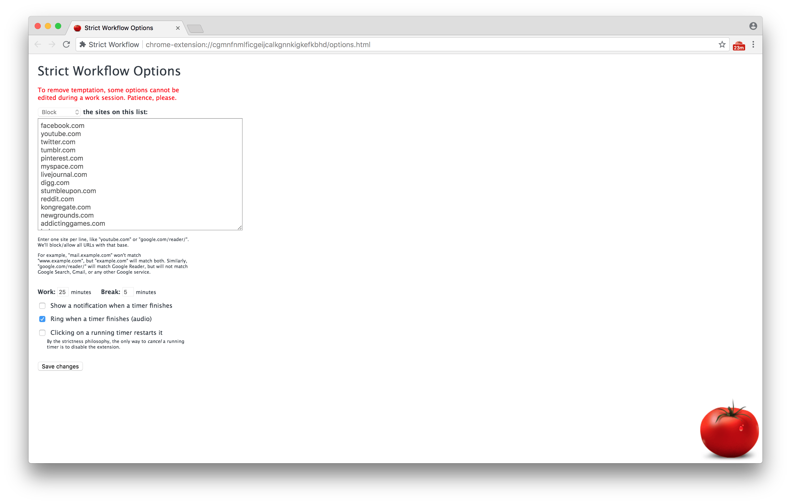 Als je geconcentreerd aan het werkt bent, wil je niet worden afgeleid. Toch is er de gewoonte om even een tabblad te openen om een Facebook-bericht te lezen of een filmpje op YouTube te bekijken. Met de extensie Strict Workflow kun je instellen welke websites gedurende een bepaalde tijd worden geblokkeerd. Een soort assistent die je op de vingers tikt als je het toch wilt proberen. Klik op het tomaatje bovenin en standaard blokkeert het 25 minuten lang allerlei afleidende websites als Twitter, Facebook, Instagram, Pinterest en YouTube. Uiteraard kun je bepalen welke sites nog meer moeten worden geblokkeerd en hoelang een blokkade moet duren. Dat doe je door met je rechtermuisknop op de tomaat te klikken en voor Opties te kiezen.
