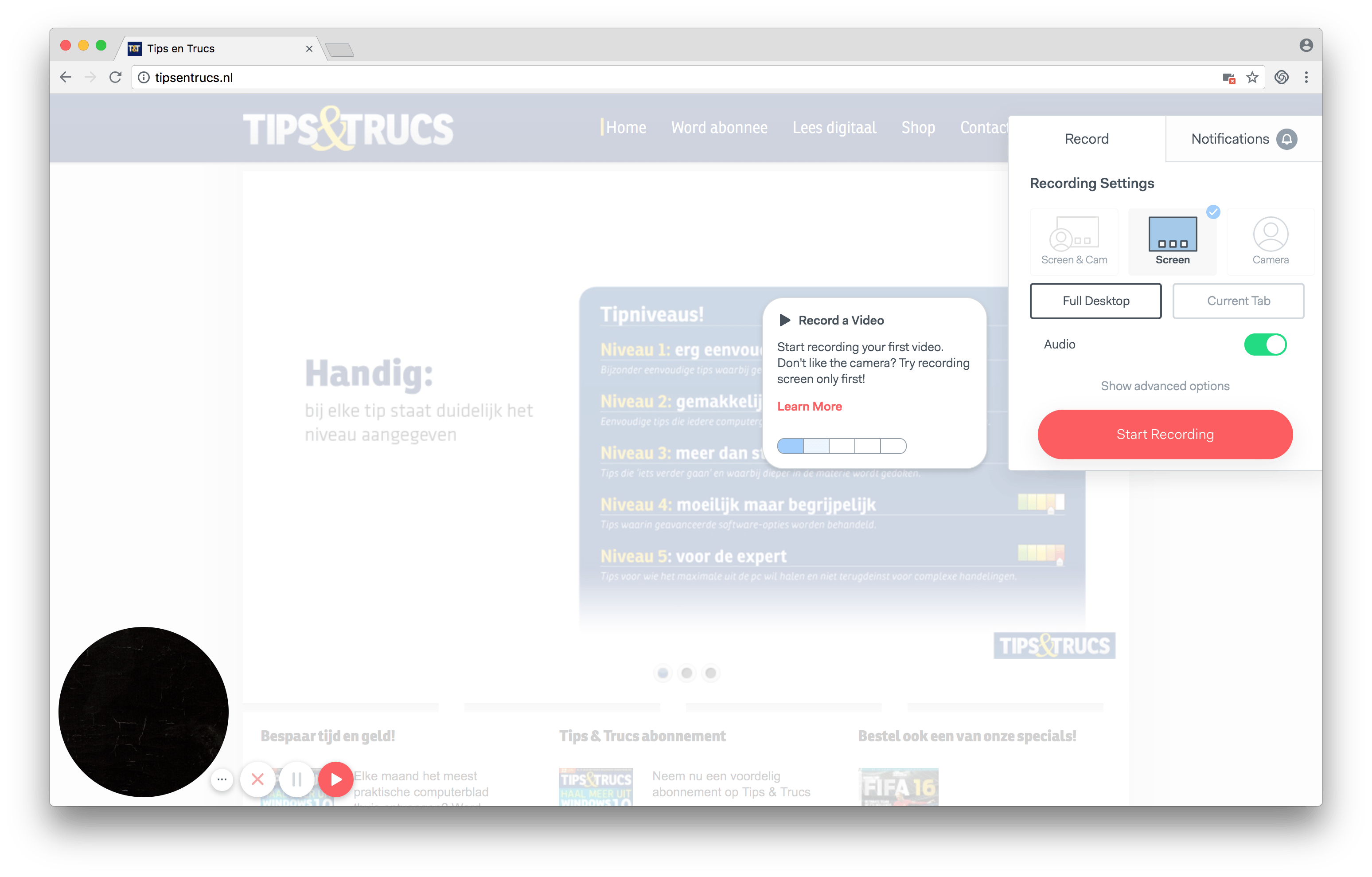 Pas op: een krachtige extensie voor Chrome! Met Loom maak je een schermvideo en deze bewerk of deel je vervolgens. Na aanmelding vraagt Loom of het toegang tot je microfoon en camera mag krijgen. Dit kun je overslaan als je alleen een opname van je scherm wilt maken. Je kunt kiezen of je je gehele scherm wilt opnemen of alleen het huidige tabblad. Met een schuif bepaal je of de audio van een site ook moet worden opgenomen of dat je je eigen stem wilt opnemen. Je video is vervolgens bereikbaar via een url; hier word je na opname meteen naartoe geleid. Je kunt de url delen, een bijschrift plaatsen of de video als mp4 naar je pc downloaden.