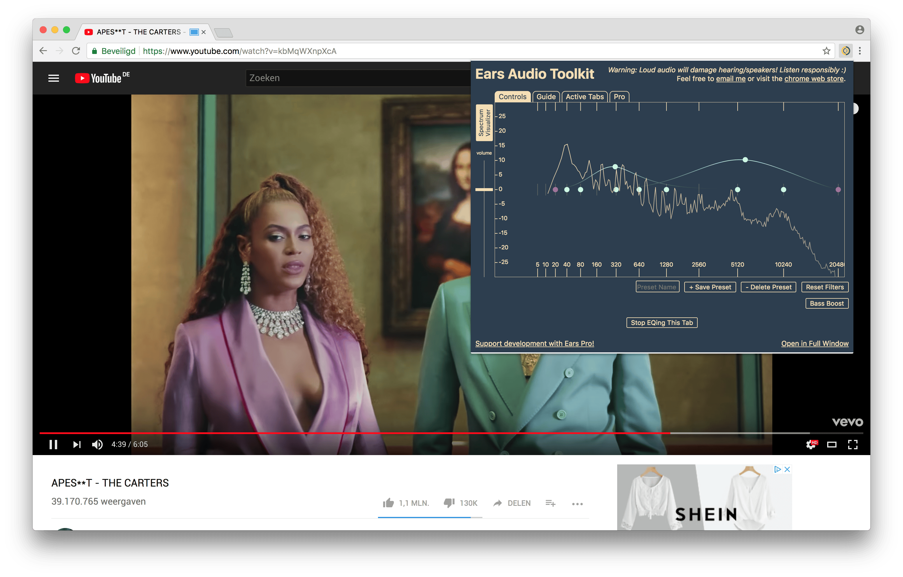 Niet genoeg bas uit je luidsprekers? Met Ears heb je een ingebouwde equalizer in je browser. Klik op het icoontje en een uitgebreide equalizer wordt over het scherm van je browser gelegd. Onder Guide lees je hoe de equalizer werkt, maar je kunt natuurlijk ook gewoon de bolletjes verschuiven. Denk er wel aan dat je luidsprekers het niet leuk vinden als je te veel van dezelfde frequentie vergroot; het is daarom aan te raden je even in te lezen op het gebied van equalizing. Je kunt presets opslaan en als je op Spectrum Equalizer klikt, zie je welke frequenties aanwezig zijn in het audiosignaal van het actieve tabblad. De knop Bass Boost zorgt meteen voor extra bas.