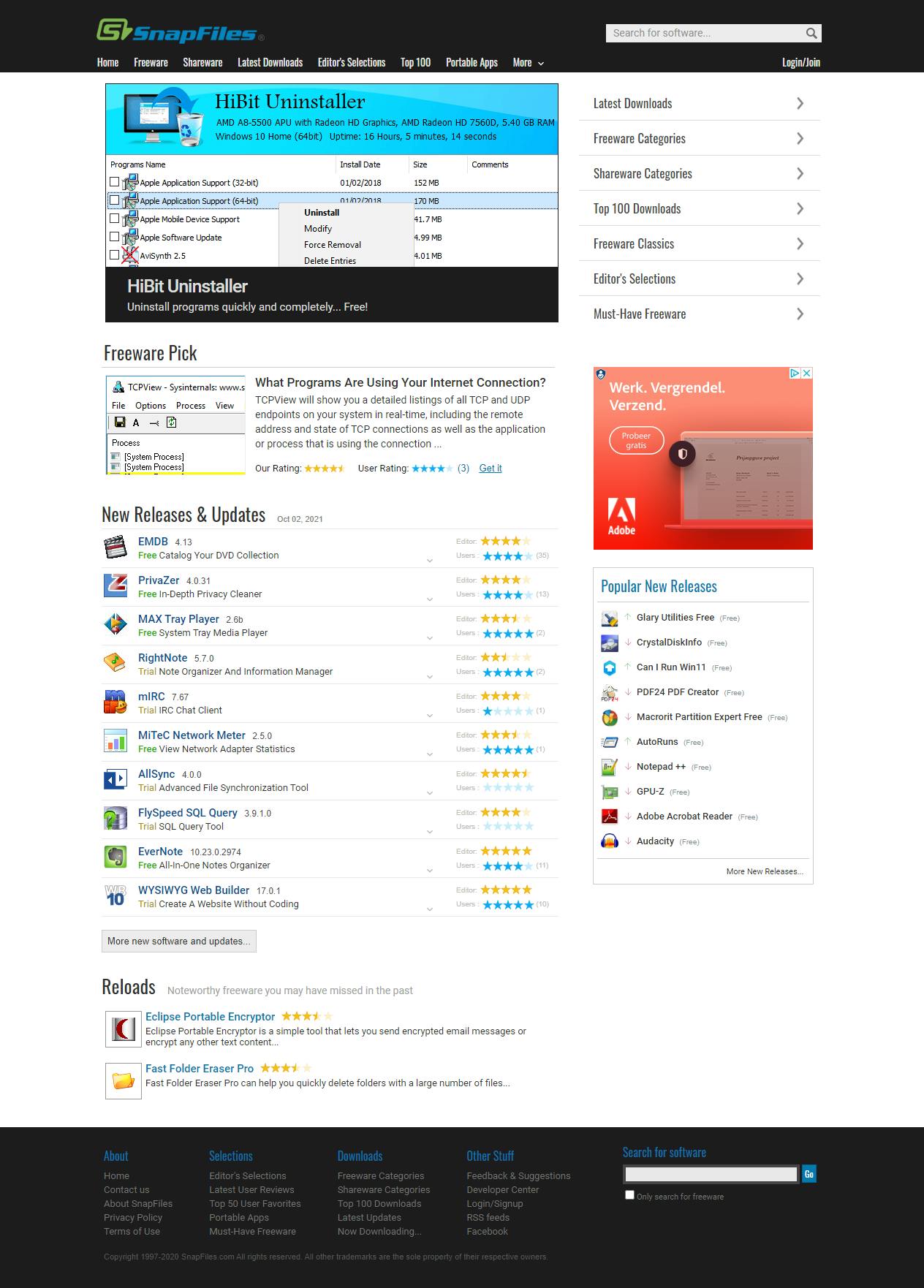 Op de website SnapFiles gaat het er visueel gezien wat verouderd aan toe, wat trouwens geen reden is om hier niet langs te gaan. De kracht van SnapFiles zit hem in de vele handig gekozen secties, waarin alle programma’s trefzeker zijn weggezet. Als je precies weet wat je hebben wilt, dan ben je zonder gebruik van trefwoorden al na enkele kliks op de juiste plek aanbeland. Het aanbevolen lijstje is Top 100 Downloads. Een mooi compact gehouden presentatie die je bezoek verdient.