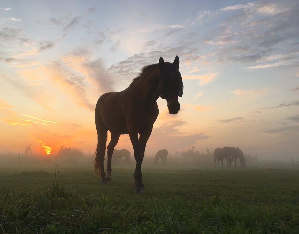De ochtendnevel en opkomende zon alleen al geven deze foto al een mysterieuze sfeer. Dat dit paard zijn vrienden in de achtergrond even verlaat om voor de fotograaf te poseren maakt de foto helemaal af.