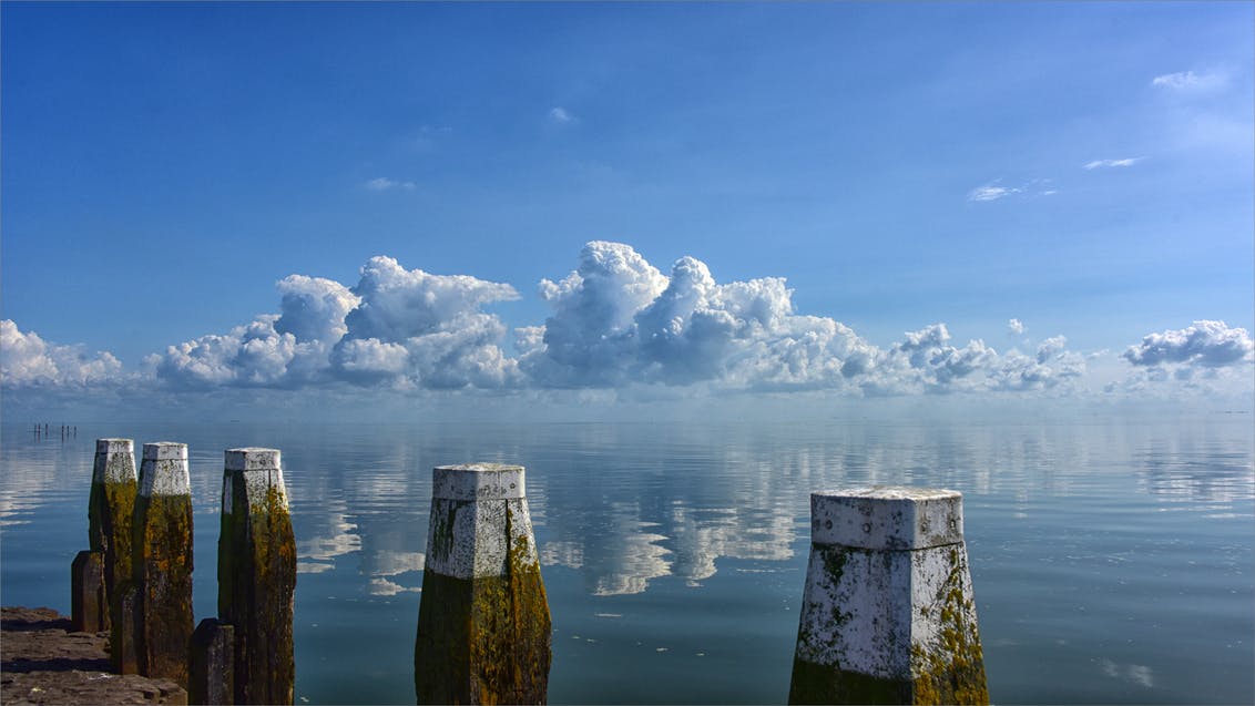 Op een windstille dag stopte deze fotograaf bij het Vlietermonument op de Afsluitdijk en schoot daar deze foto van een golfloze Waddenzee.