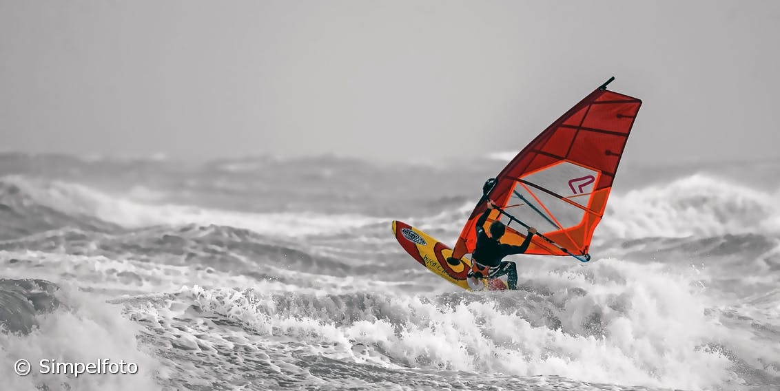 Deze surfer deinst niet terug voor wat deining. Los van de indrukwekkende capriolen van de surfer, maakt het contrast tussen onderwerp en achtergrond deze foto helemaal compleet.