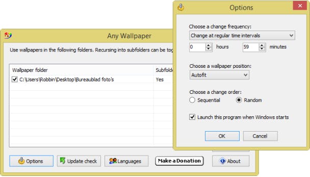 Klik op het Any Wallpaper-icoontje met de rechtermuisknop en kies in het keuzemenu voor Restore main Window. Klik op Add en voeg de map toe met je foto's toe. Bij Options kun je aangeven hoe vaak Any Wallpaper de afbeelding moet wisselen. Kies bij Wallpaper position voor Autofit. Vanaf nu wisselt Any Wallpaper je bureaubladfoto automatisch. Dubbelklik op het Any Wallpaper-icoontje om handmatig over te schakelen naar de volgende achtergrond. Let op: de download van Any Wallpaper staat hier en komt binnen met allerlei overbodige extra's die je niet nodig hebt. Wees alert tijdens de installatie om dit te voorkomen.