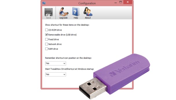 Handig toch? Je hoeft bijna niets in te stellen! Start DriveShortcut en plaats een vinkje bij Removable drive (USB Drive). Kies Yes bij Start TweakNow DriveShortcut at Windows startup als je de handige functie van DriveShortcut altijd wilt gebruiken.