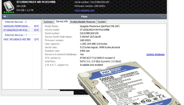 Ook is de aansluitmethode eenvoudig af te lezen, bijvoorbeeld SATA3 bij Device info / Interface. Voor harde schijven is de rotatiesnelheid belangrijk. Deze staat bij Device information / Rotation rate. De meeste laptops hebben een harde schijf met 5400 rpm, bij desktop-pc's is dit een snellere 7200 rpm. Omdat SSD's geen bewegende delen hebben, is rpm hier niet van toepassing. SSD-gebruikers kunnen het programma overigens beter niet gebruiken.