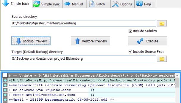 We maken op de usb-stick bijvoorbeeld de map Back-up werkbestanden project aan. Deze map kiezen we in het Zback-programma bij Target. Klik op Backup preview. Het programma laat zien wat er wordt geback-upt. Klik op Execute om de back-up uit te voeren. Zback heeft ook een goede synchronisatiefunctie aan boord, maar hiervoor geldt een waarschuwing voor beginners. Bij synchroniseren worden bestanden in twee richtingen gekopieerd en (indien nodig) verwijderd.