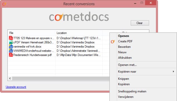Soms heb je een Word-bestand en wil je hiervan een pdf-bestand maken, of heb je juist een pdf-bestand terwijl je een Word-document nodig hebt. Op de website kun je bestanden eenvoudig om laten zetten naar een andere indeling. Het programmaatje Cometdocs Desktop App brengt deze opties naar je rechtermuisknop. Maak tijdens de installatie een gratis account aan bij de webdienst. Vervolgens gebruik je Cometdocs Desktop App direct vanuit Windows Verkenner.
