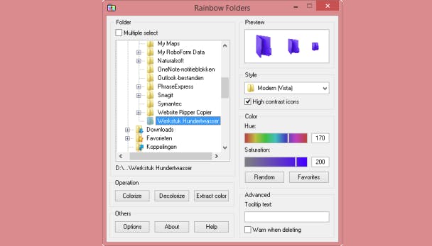 Zo herken je tussen de vele mappen snel de map die je zoekt. Start Rainbow Folders en wijs de map aan die je een afwijkende kleur wilt geven. Kies rechts in beeld je kleur en pas eventueel de stijl aan. Bevestig met Colorize om de kleur te veranderen. De knop Decolorize maakt de aanpassing ongedaan. In Windows 7/8 kan het even duren voordat de nieuwe kleur zichtbaar wordt. Geef alleen de mappen die je regelmatig nodig hebt een kleurtje, dan heeft Rainbow Folders echt een meerwaarde.