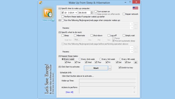 WakeupOnStandBy kan een Windows-systeem uit een energiebesparende stand doen ontwaken. Geef aan wanneer je je computer aan wilt hebben, bijvoorbeeld elke dag om 8:30 uur. Optioneel kun je een taak kiezen die WakeupOnStandBy voor je uit moet voeren, bijvoorbeeld je downloadprogramma opstarten. WakeupOnStandBy kan het systeem alleen wakker maken als je een energiebesparende stand gebruikt, bijvoorbeeld de slaapstand of sluimerstand van Windows 8.1.