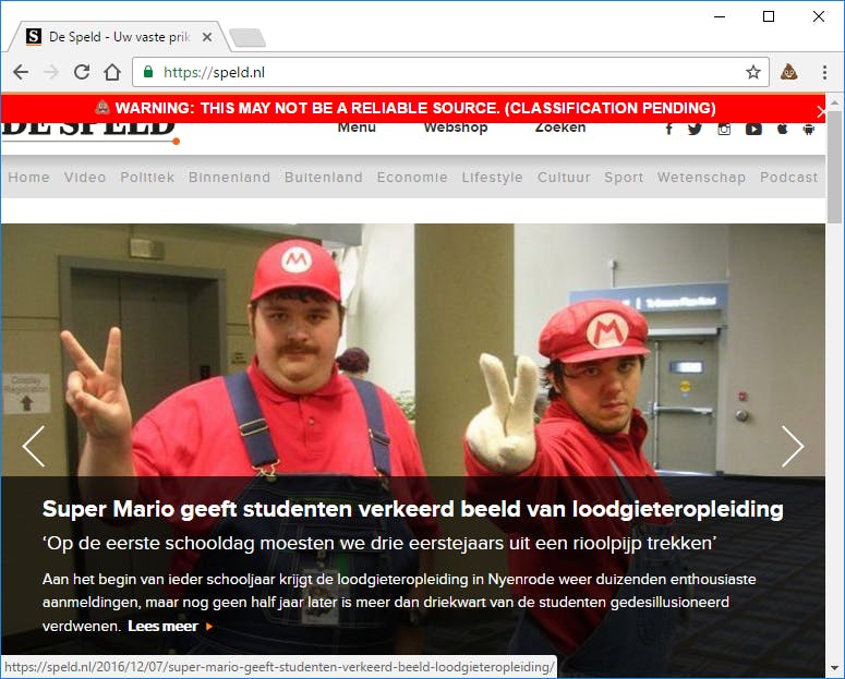 ’ waarschijnlijk niet bestaan op YouTube. B.S. Detector is een browseruitbreiding die probeert nepnieuws te detecteren. We hebben uiteraard een paar tests gedaan. De resultaten waren wisselend. Zo werd de website www.speld.nl keurig herkend en aangemerkt als ‘een niet al te betrouwbare bron’. Facebook-berichten van De Speld werden echter niet herkend. Toch is B.S. Detector de moeite waard om uit te proberen. Met een beetje geluk weet je snel of je een echt bericht leest of dat je je tijd verspilt aan een grapje van iemand anders.