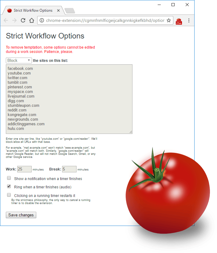 Soms is het moeilijk om gedisciplineerd te werken en laat je jezelf voortdurend afleiden door bepaalde websites en sociale media. Een andere valkuil voor sommige mensen is het ‘doorwerken om het doorwerken’. Zonder pauze te nemen wordt er uren aaneengesloten gebuffeld achter de tekstverwerker of spreadsheet. Strict Workflow is een uitbreiding voor Google Chrome en biedt een oplossing voor beide problemen. Strict Workflow werkt volgens de pomodorotechniek. Hierbij werk je steeds in blokken van 25 minuten, afgewisseld door korte pauzes. Als je timer eenmaal loopt, kun je bepaalde websites niet bezoeken. Websites als YouTube, Facebook en Twitter worden tijdelijk geblokkeerd. De volledige lijst vind je in de instellingen van Strict Workflow en kun je eenvoudig aanpassen.