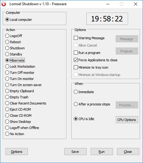 Zodra je computer enige tijd niet wordt gebruikt zal Windows Energiebeheer de slaapstand activeren, zelfs als je systeem in de achtergrond nog bezig is. Met Lomsel Shutdown kun je acties koppelen aan een bepaalde toestand van je systeem. Lomsel Shutdown kan bijvoorbeeld je processor in de gaten houden. Als deze gedurende enige tijd niet belast wordt boven de 50%, kun je Lomsel Shutdown je systeem laten afsluiten. Ook zijn andere instellingen mogelijk, zoals slaapstand, afmelden, Windows vergrendelen, et cetera. Wanneer is dit handig? Nou, bijvoorbeeld bij het maken van back-ups of het uitvoeren van grondige scans door je beveiligingsprogramma. Deze klussen duren vaak lang, dus voer je de werkzaamheden ‘s nachts uit. Start de controle en kijk via Windows Taakbeheer (Ctrl+Shift+Esc) hoe de processorbelasting is. Ga hier iets onder zitten en stel dit percentage in bij CPU is idle. Koppel hier een actie aan, bijvoorbeeld Hibernate. Zodra de scan is afgerond en je systeembelasting dus afneemt, activeert Lomsel Shutdown automatisch de slaapstand. Dit is slechts een van de vele mogelijkheden. Voor de techneuten onder ons zijn er allerlei scenario’s denkbaar. Ook kun je de acties door Lomsel Shutdown laten koppelen aan een sneltoets.