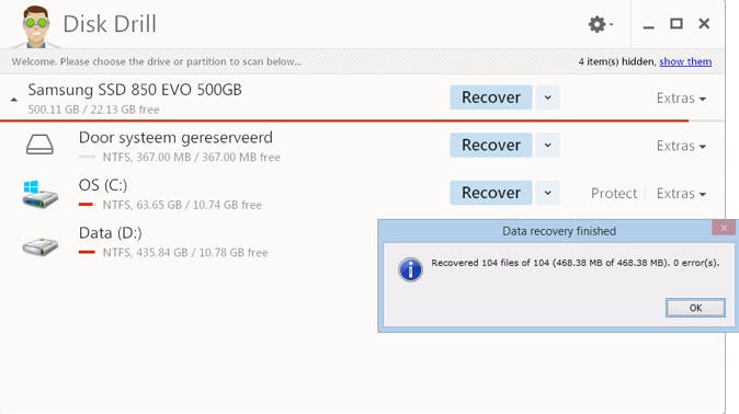 Het kan iedereen overkomen: je bent lekker aan het werk en plotseling mis je een bestand of map. Per ongeluk weggegooid? Geen paniek! Disk Drill is gespecialiseerd in het zoeken en herstellen van verwijderde bestanden. Het programma kijkt eerst naar sporen waarna je kunt bladeren door de verwijderde bestanden en mappen. Selecteer de bestanden (of mappen) die je wilt herstellen en klik op Recover. Herstel bij voorkeur naar een andere schijf (of usb-stick) dan de originele opslaglocatie.