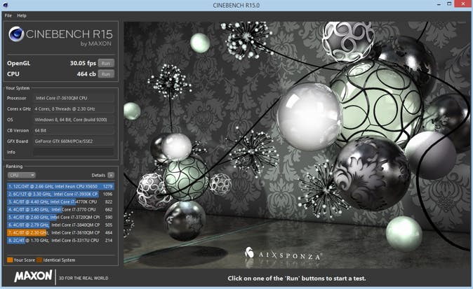 Als je een snelle pc of laptop hebt aangeschaft voor gaming, wil je natuurlijk weten hoe snel! Maxon Cinebench geeft je computer op z'n donder en vraagt het uiterste van je grafische kaart. De test bestaat uit twee onderdelen: OpenGL en CPU. De OpenGL-test draait voornamelijk op de gpu, de grafische processor van je videokaart. De cpu-test belast de systeemprocessor. Na afloop toont Maxon Cinebench hoe jouw computer zich verhoudt tot andere systemen.