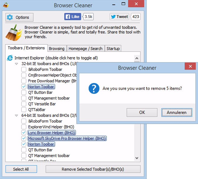 Heb je per ongeluk een ongewenste werkbalk in je webbrowser geïnstalleerd? Verwijderen wordt eenvoudig dankzij Browser Cleaner! Het programma toont alle geïnstalleerde uitbreidingen in Internet Explorer en Firefox. Sluit je webbrowsers en start Browser Cleaner. Vink de onderdelen aan die je wilt verwijderen en bevestig met Remove selected toolbars.