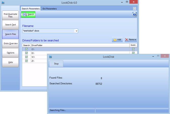 Windows heeft een goede zoekfunctie aan boord, maar het kan altijd beter! Dankzij LookDisk zoek je snel naar een bepaald bestand, bijvoorbeeld door een gedeelte van de naam op te geven bij Search files. Weet je de bestandsnaam niet, maar wel wat er in het document staat dat je zoekt? Laat LookDisk dan met Search tekst zoeken naar een stukje tekst. LookDisk zoekt standaard in alle schijfletters die aanwezig zijn op je computer. Ook gekoppelde schijfletters van bijvoorbeeld een netwerk harde schijf (NAS) kun je laten doorzoeken.