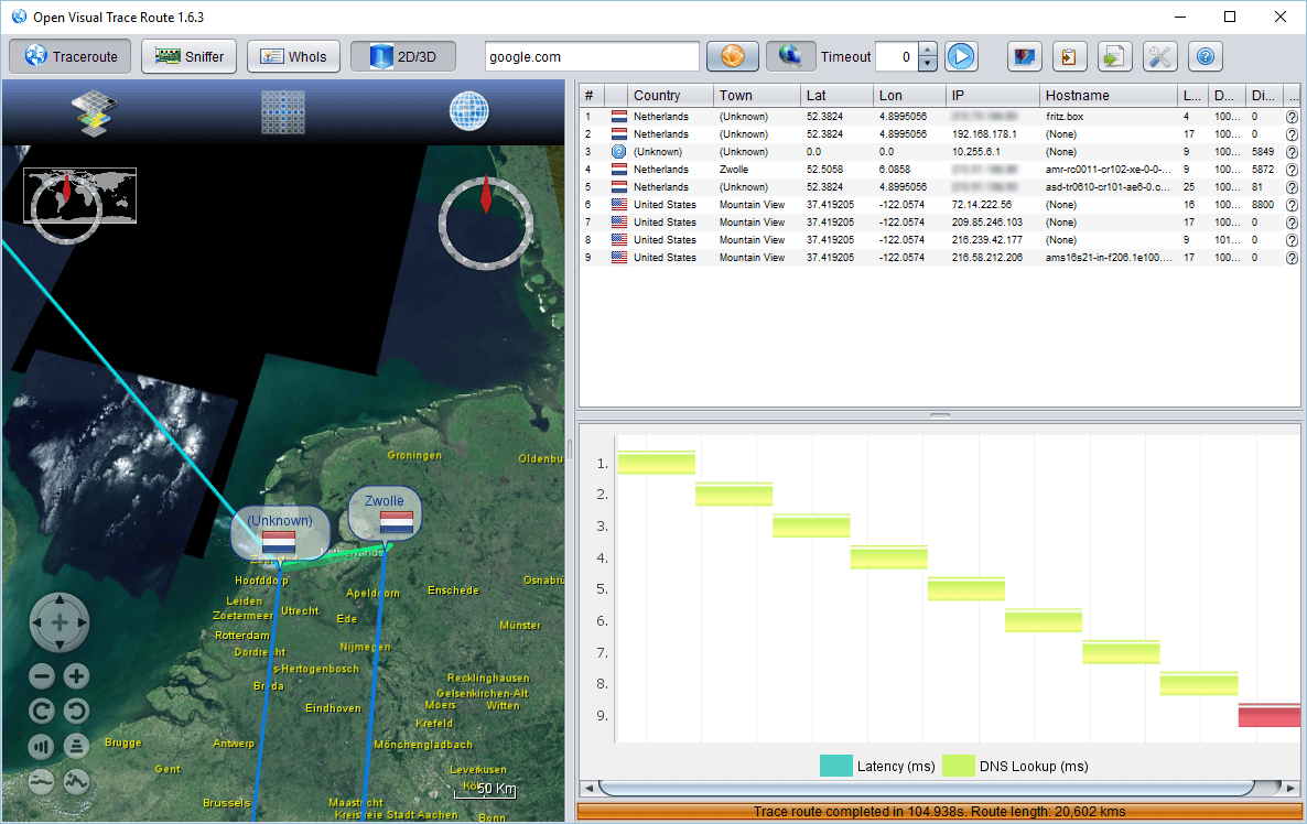 Internet bestaat uit een aaneenschakeling van routers, servers en ‘pijplijnen’. Hier merk je tijdens het browsen niets van, want alle routes worden netjes automatisch afgelegd zodat jij een website op je scherm te zien krijgt. Als je benieuwd bent naar de technische route, geeft Open Visual Traceroute daar een fraaie weergave van. Open Visual Traceroute voert een ‘trace route’ uit waarbij je de tussenstations ziet die worden gepasseerd tussen jouw internetverbinding en de webserver van een website. Open Visual Traceroute voegt hier geografische informatie aan toe, zodat je op een wereldkaart ziet welke route er wordt afgelegd. Tik een webadres (of IP-adres) in, druk op Enter en wacht geduldig af. Het resultaat is een technische weergave met vertragingen en een wereldbol met lijnen van de afgelegde route. Dankzij Open Visual Traceroute zie je dat aan het openen van een website een complete wereldreis voorafgaat.