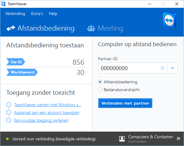 Als je iemand op afstand wilt helpen met computerproblemen, biedt TeamViewer nog steeds de beste oplossing. Degene die geholpen wil worden, hoeft slechts één bestandje te downloaden en te starten: TeamViewer QuickSupport. Dit onderdeel vindt de ‘hulpbehoevende’ op de website van TeamViewer, via Download / Deelnemen aan afstandsbedieningssessie. Na het opstarten van TeamViewer QuickSupport wordt een code (id) en wachtwoord getoond. Om hulp te bieden, heb je wel de volledige versie van TeamViewer nodig. Na het intypen van de code en het wachtwoord van je partner kun je zijn of haar scherm, toetsenbord en muis overnemen via internet. Deze oplossing werkt snel en veilig. Na het verbreken van de verbinding is opnieuw verbinden niet mogelijk, en dat is een prettige gedachte. Het gebruik van de TeamViewer-oplossing is gratis voor niet-commercieel gebruik.