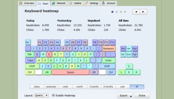 WhatPulse toont een overzicht met hierin statistische informatie, zoals het aantal muisklikken, toetsenbordaanslagen en de hoeveelheid netwerkverkeer. Het wordt interessanter als je de tabbladen bekijkt. Bij Input zie je welke toetsen je het meest gebruik. Grote kans dat de spatietoets en e-toets het meest populair zijn. Klik op de pijl naar rechts (of links) in het scherm Inpunt voor meer informatie, bijvoorbeeld in welke programma's je de muis en toetsenbord het meest frequent gebruikt. De Mouse heatmap laat zien op welke plekken in het scherm je vaak (dubbel) klikt.