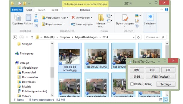 Foto's 'bewerken' en 'verwerken' zijn twee verschillende dingen. Om foto's te bewerken, heb je een bewerkingsprogramma nodig zoals The GIMP of Photoshop. Met verwerken bedoelen we het omzetten naar een ander formaat (bijvoorbeeld van png naar jpg) of verkleinen van afbeeldingen. Dit laatste doe je bijvoorbeeld als je foto's wilt delen via mail of sociale media. SendTo-Convert voegt handige verwerkopties toe aan je rechtermuisknop om fotobestanden aan te passen. Zorg er voor dat het vinkje bij Add to Send To menu actief is tijdens de installatie. Selecteer één of meerdere afbeeldingen in Windows Verkenner. Klik met de rechtermuisknop op de selectie en kies Kopiëren naar / SendTo-Convert. Klik op een van de bestandsformaten, bijvoorbeeld PNG of JPG om het fotobestand om te zetten naar deze indeling. Plaats eerst een vinkje bij Resize om de foto's kleiner te maken.