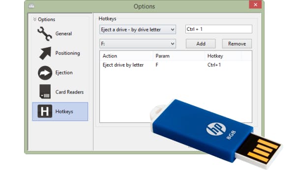 Je dient er zelf voor te zorgen dat USB Disk Ejector automatisch opstart met je computer, bijvoorbeeld door een snelkoppeling in de map Opstarten te plaatsen. USB Disk Ejector staat nu in je systeemvak. Open het programma om te zien welke externe media er verbonden zijn. Dubbelklik op de media om de verbinding te verbreken of stel een toetscombinatie in via More / Options / Hotkeys. Kies voor Eject a drive by drive letter en kies de schijfletter van de externe schijf of usb-stick, bijvoorbeeld F. Stel een sneltoets in, bijvoorbeeld Ctrl+F1 en bevestig met Ok. Vanaf nu kun je schijfletter F altijd snel en veilig verwijderen met deze toetscombinatie.