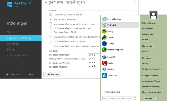 Het klassieke startmenu wordt door veel mensen nog steeds gemist in Windows 8.1. Het onderdeel zal volgens geruchten pas in 2015 terugkeren, maar in welke vorm dit zal zijn is onduidelijk. Wie niet op Microsoft wil wachten, krijgt het startmenu eenvoudig terug met Start Menu 8. Na de installatie is het klassieke startmenu direct zichtbaar op de vertrouwde plek. Je kunt de vormgeving en opties van Start Menu 8 aanpassen. Klik met de rechtermuisknop op de startknop van Start Menu 8 en kies Instellingen. Bij Startknop kun je de afbeelding kiezen van de gelijknamige knop, bijvoorbeeld een Windows 8-knop of de klassieke Windows 7-bol. Bij Algemene instellingen bepaal je hoe het startmenu zich moet gedragen. Ook kun je hier de zijbalk (Charms-bar) uitschakelen en ervoor zorgen dat de bureaubladweergave van Windows 8/8.1 standaard activeert. Vind je je startmenu te vol en onoverzichtelijk? Kijk dan bij Menu en verberg de onderdelen die je niet of nauwelijks gebruikt.