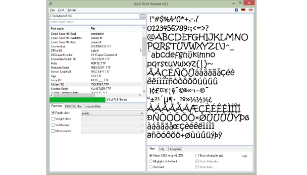 In Windows zijn veel verschillende lettertypes geïnstalleerd. Je vindt deze onder meer terug in een grafisch programma als Photoshop en je tekstverwerker. Om snel door alle beschikbare fonts te bladeren, is het hulpje dp4 Font Viewer handig. Installatie is niet nodig. Je kunt dp4 Font Viewer direct na het downloaden en uitpakken gebruiken. dp4 Font Viewer laadt alle lettertypes uit een map. Gebruik je pijltjestoetsen om snel door je collectie te bladeren. Ook kun je lettertypes filteren op eigenschappen (bijvoorbeeld wel of geen vet) of een bepaalde categorie (family class genaamd).