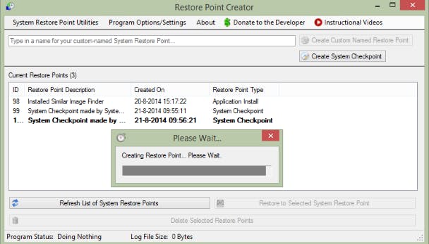 Windows Systeemherstel kan je laatste redmiddel zijn als je computer niet meer opstart. Als je gaat experimenteren met programma's of Windows-instellingen is het altijd verstandig om een herstelpunt aan te maken. Soms gaat dit automatisch, maar niet altijd. Je kunt handmatig een herstelpunt aanmaken met Windows Systeemherstel, maar het gaat beter met het tooltje Restore Point Creator. Installeer en start het programma, en klik op Create System Checkpoint om direct een herstelpunt aan te maken. Je herstelpunt wordt getoond in de lijst.