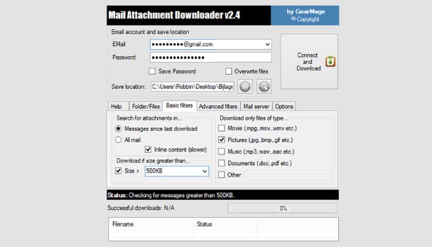 Geef je mailadres en wachtwoord op en klik op de knop Connect and download om alle bijlagen binnen te halen. Let op: de kans is groot dat je zeer veel bijlagen binnenkrijgt. Om dat te voorkomen, kun je het beste een paar filters instellen voordat je Mail Attachment Downloader aan het werk zet. Geef bijvoorbeeld bij Basic filters aan dat je alleen bestanden van 1 MB of groter wilt hebben. Of geef met een vinkje aan dat je alleen bestanden van een bepaald type binnen wilt halen, bijvoorbeeld alleen fotobestanden.