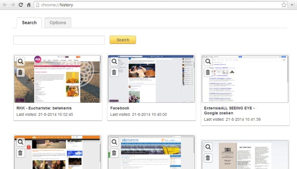 Met de toetscombinatie Ctrl+H open je in Google Chrome je surfgeschiedenis. Je krijgt een lange lijst te zien van websites die je bezocht hebt. Je kunt beperkte zoekopdrachten geven, maar vaak is dit te vergeefs. Je hebt bijvoorbeeld eergisteren ergens iets gelezen, maar weet de website niet meer en je zoekopdracht in je surfgeschiedenis biedt geen uitkomst. De Chrome-extensie All Seeing Eye geeft je surfgeschiedenis een visuele zoekmogelijkheid. Vanaf nu krijg je met Ctrl+H ook miniaturen van de bezochte websites.