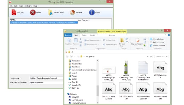 Bevestig met Extract Now. PDF Extractor analyseert je pdf-bestand en dumpt alles wat er gevonden wordt in de opgeven map. Bij een aantal testbestanden troffen we hier de afbeeldingen aan van het pdf-bestand, de tekst in een kladblok-bestand en zelfs losse lettertypebestanden.